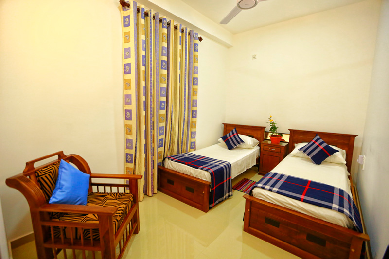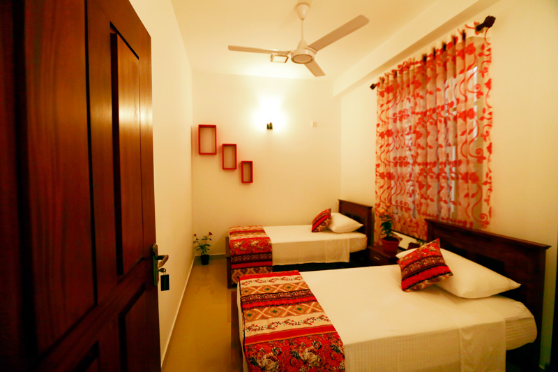 Second bedroom contains two single beds, closet space, bedsheets and pillows.