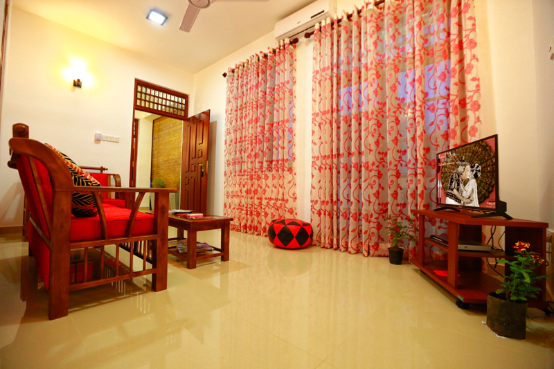 Living room contains a Flat television, DVD player and living room furniture.